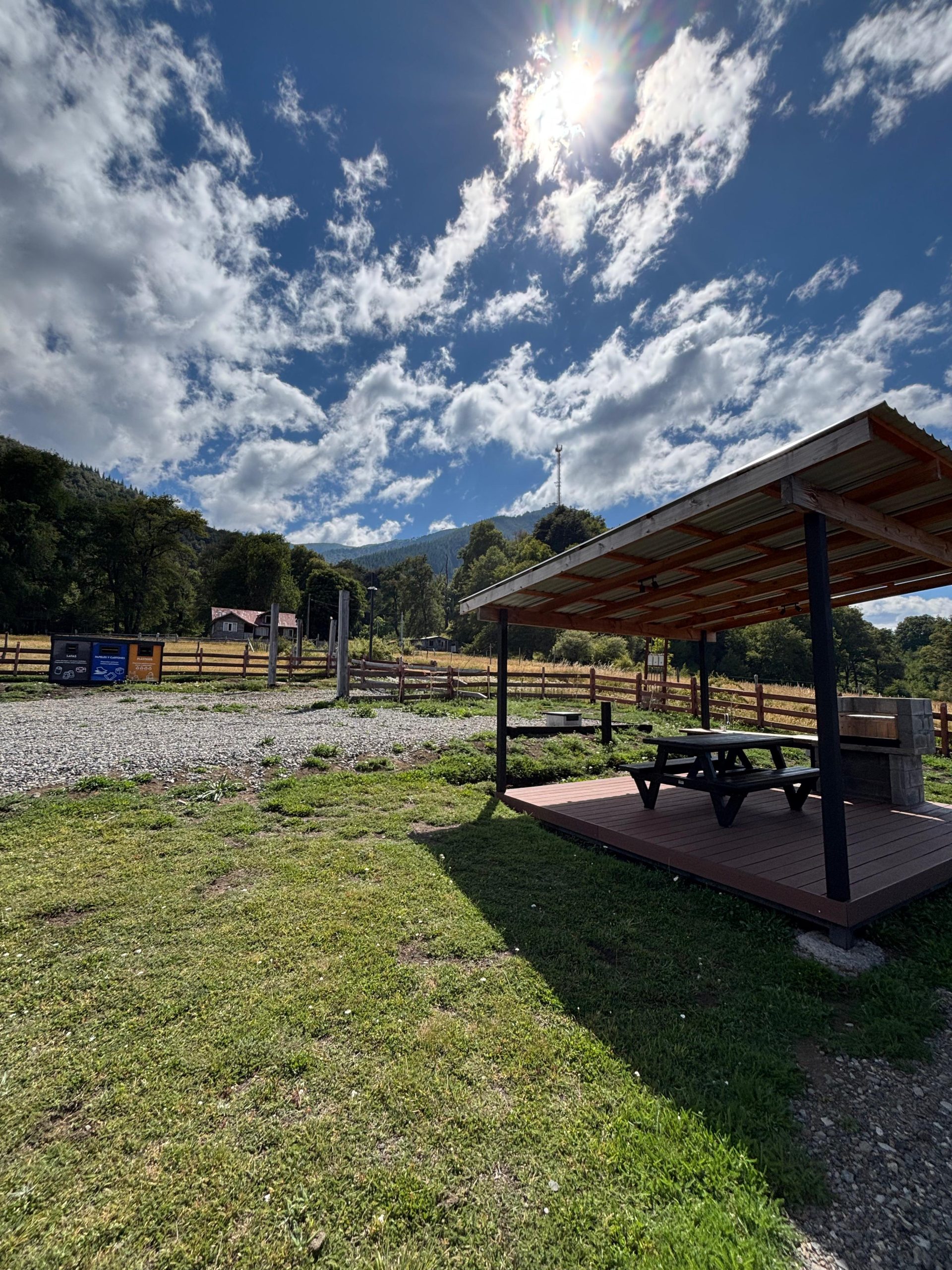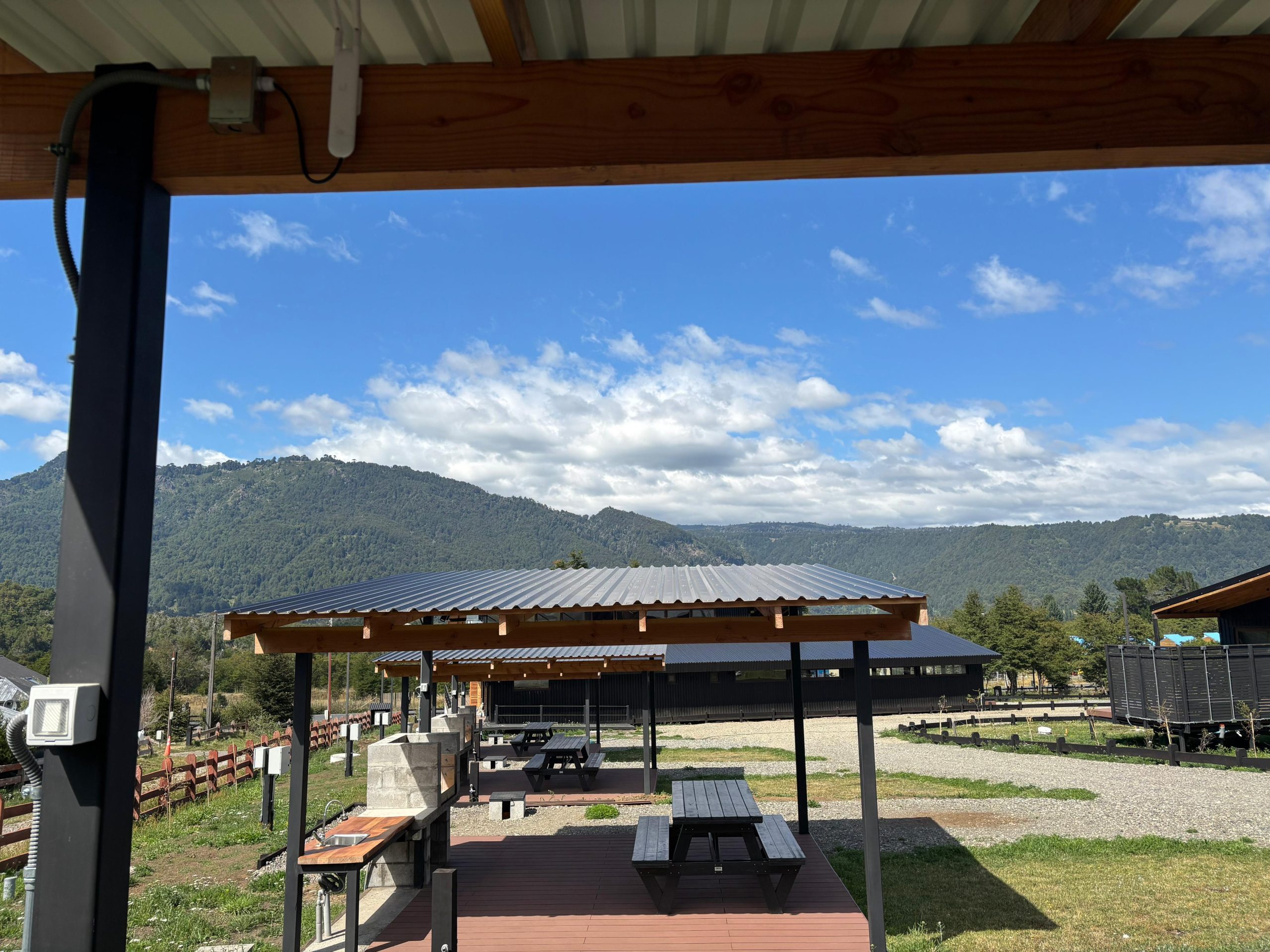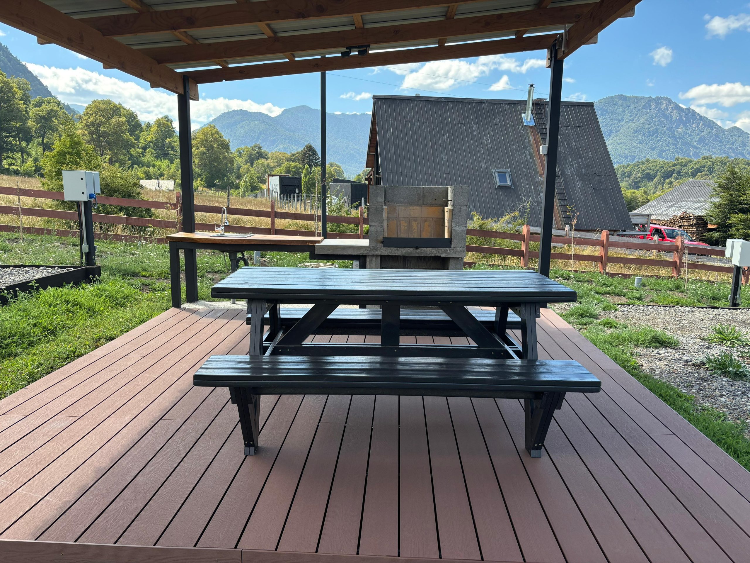 - Quincho equipado con parrilla, luces, tomacorrientes para carga, mesa de camping de plástico reciclado con capacidad para 8 personas y lavaplatos empotrados.