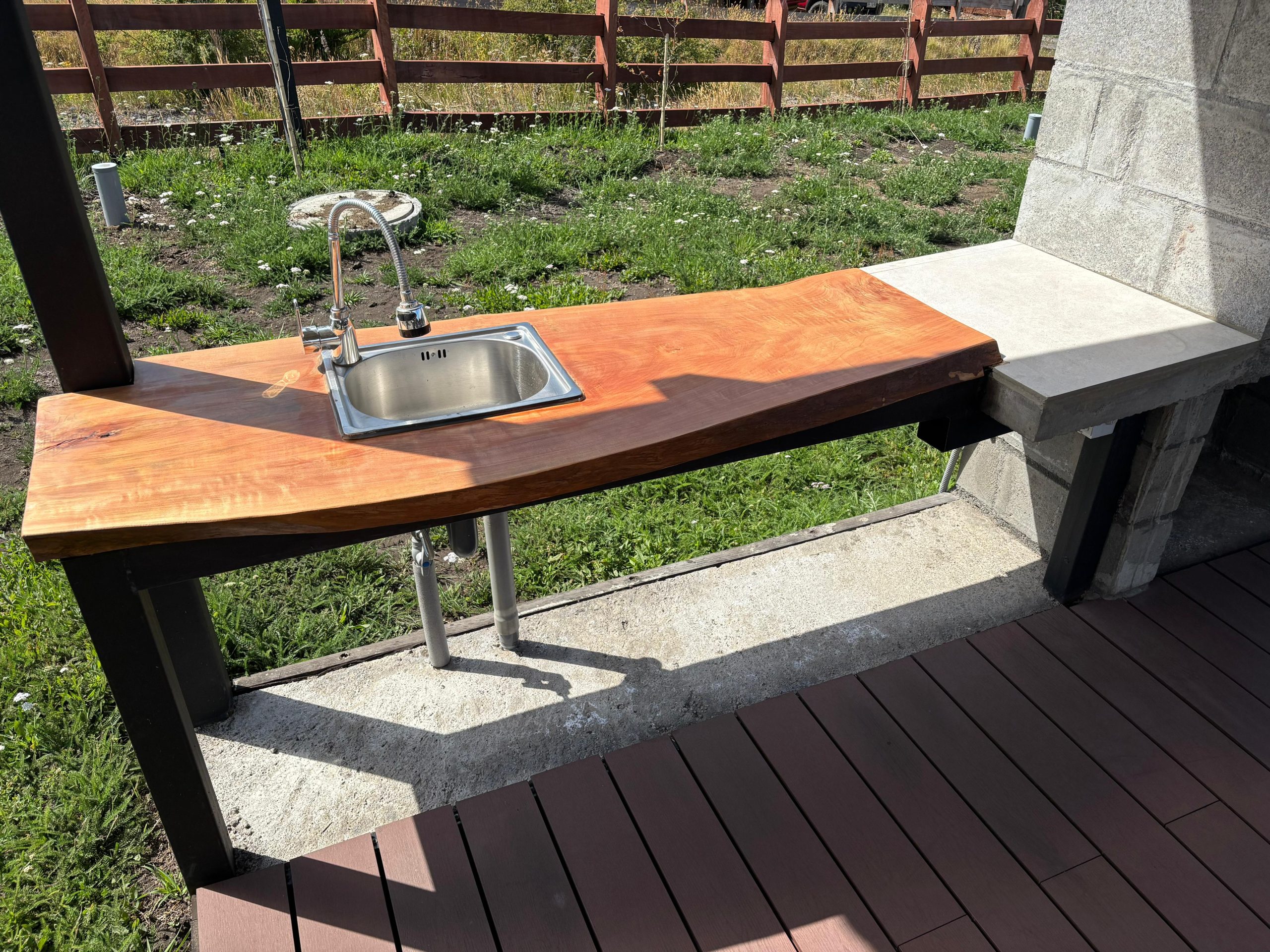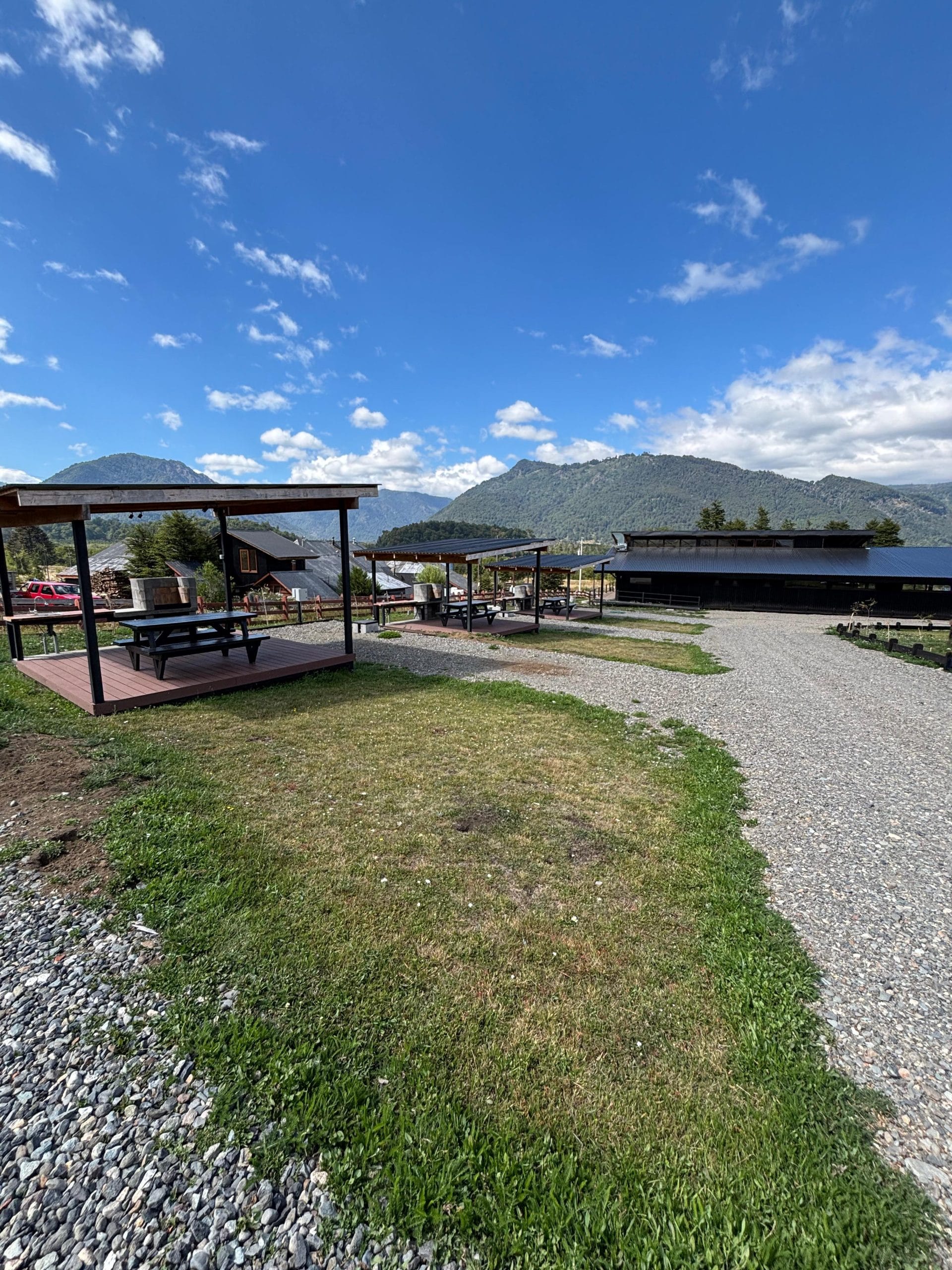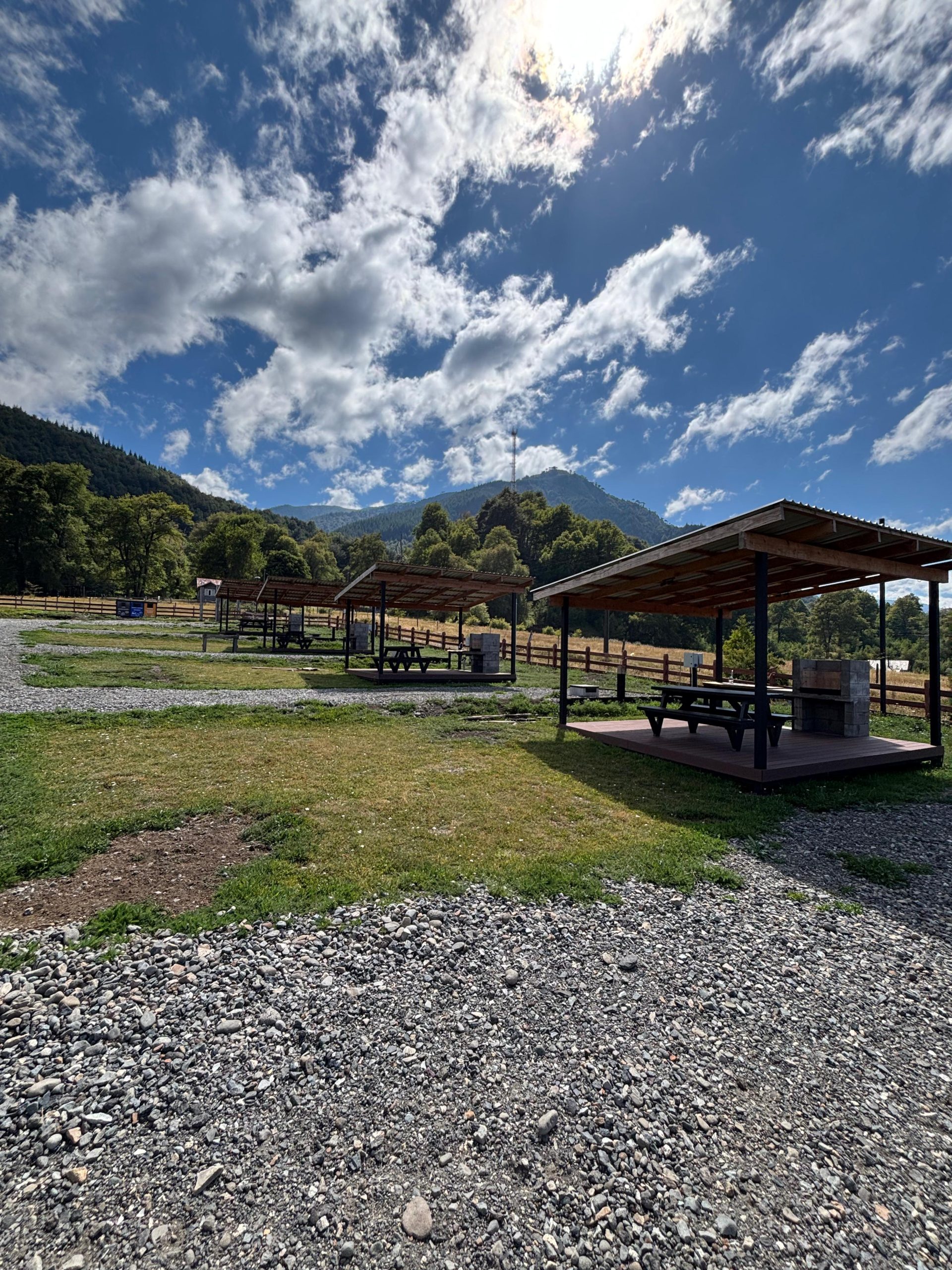 - Quincho equipado con parrilla, luces, tomacorrientes para carga, mesa de camping de plástico reciclado con capacidad para 8 personas y lavaplatos empotrados.